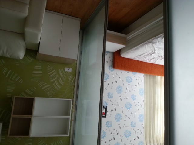 มีเฟอร์นิเจอร์ ตู้เย็น แอร์ ที่จอดรถ มีกระจกกั้นห้องนอนกับห้องนั่งเล่น ห้องครัว